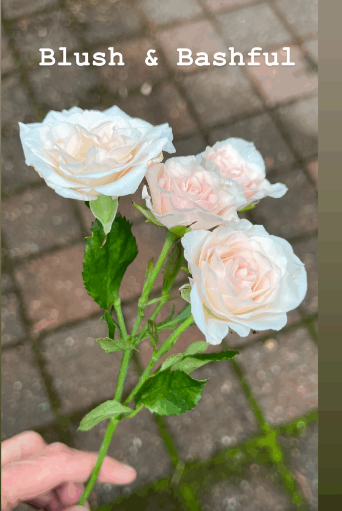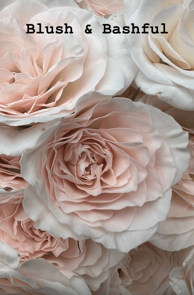 Blush and Bashful is a very pale blush spray rose with large flowers. Long stemmed bunches have multiple flowers. It’s the perfect wedding rose! Our roses are available from late April through December.