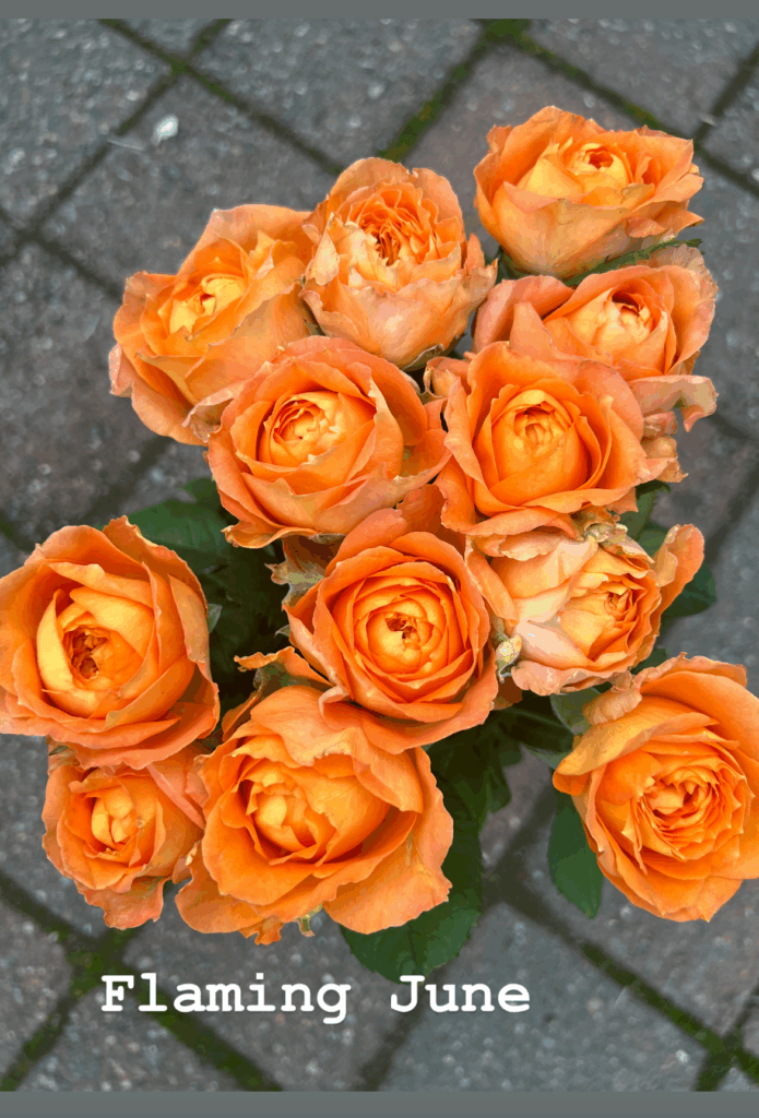 Flaming June by Peterkort Roses – A bright orange garden rose with a rounded shape. Available from May through December.